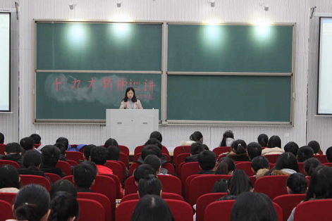 首先,团委老师张晶给同学们讲了十九大的大会主题,指出中国共产党的初心和使命就是为中国人民谋幸福、为中华民族谋复兴,要求每位同学都需把大会主题牢记在心。接着结合社会的发展变化实例向同学们介绍了在我党领导下的过去五年的历史性成就和历史性改革,案例丰富且直观的让同学们感受到国家的发展变化成果。然后根据习近平总书记在十九大报告中关于青年一代最新指示,指出我校“大志,大爱,大雅”三大教育方针与十九大中提出青年一代要“有理想,有本领,有担当”深度契合,需要学生在日常的学习生活中积极贯彻落实党的十九大精神。最后对同学们提出学习十九大精神的具体要求,要求同学们要读十九大精神原文、要看主流抓主干、要坚持学而思学而行,并分享了一些学习十九大精神的平台。巡讲结束后现场响起了雷鸣般的掌声,张晶老师的细致讲解,使同学们受益匪浅,无一不流露出为祖国自豪的神情。