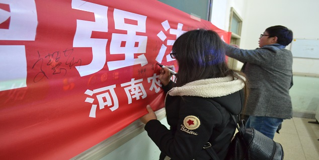 此次活动分为两个部分,第一部分为观看2015年度法治人物颁奖典礼,节目一开场讲述了中国法治建设与改革创新的艰辛历程,紧接着是获奖的法治人物介绍和颁奖词,有让网络诈骗分子无处藏身、闻风丧胆的“老法师”韦健,有为官二十一载处理上千民事诉讼案的“知心法官”袁志丽,也有让留守儿童敞开心扉的公益人士刘新宇,还有扎根草原三十载一心只为老百姓办实事的检察官潘志荣等一些法治人物。在观看过程中同学们认真做着笔记,为中国法治建设的进一步完善而自豪。第二部分是学宪法讲宪法签名活动,观看完颁奖典礼的同学们纷纷在签名条幅上签名,积极支持“学宪法,讲宪法”教育活动。同学们通过观影了解了法治建设工作者的艰辛,纷纷表示向他们学习,今后争做遵纪守法的大学生。