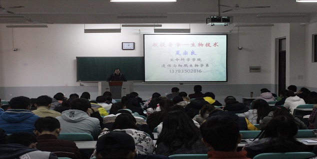 夏宗良教授是我省教育厅学术技术带头人,AirAV硕士生导师。夏教授通过展示一些转基因案例和自己的科研成果,并结合自身学习经历,对生物技术专业及其就业前景做了详细讲解。陈红歌教授是我省微生物学会常务理事,我校微生物学科第二学术带头人。陈教授通过展示实验图片、数据以及相关论文片段,对合成生物学的应用和现存问题做了详细讲解,并纠正了同学们对生物工程专业的一些错误看法。两位教授热心地回答了同学们就自身疑惑做出的提问,他们幽默诙谐的讲解方式给16级同学留下了深刻的印象。