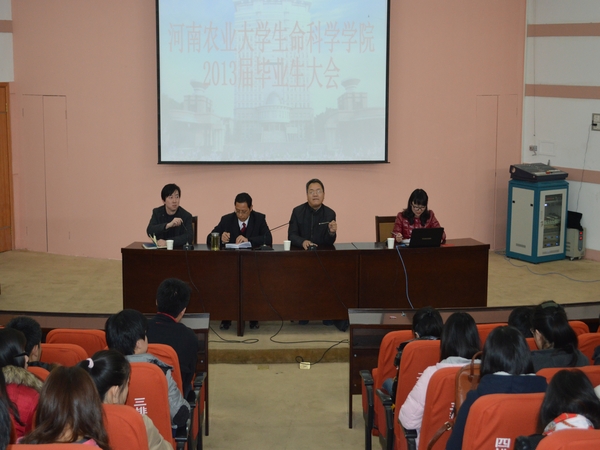 大会第一项由吴建宇院长对2013届毕业生的考研调剂情况、复试以及毕业实习进行了详细的阐述并现场解答了毕业生们提出的有关考研、实习等方面的问题;大会第二项由雷雯老师就毕业生工作安排进行了发言,对就业协议书、人事代理、毕业生离校手续、助学贷款的提前还款等相关事宜进行了详细的说明;最后,刘全军书记作重要讲话,朴实的话语表达了对毕业生的殷切希望和真诚祝福,并对毕业生提出了“好好学习 天天向上 善待他人 善待自己”的十六字箴言。