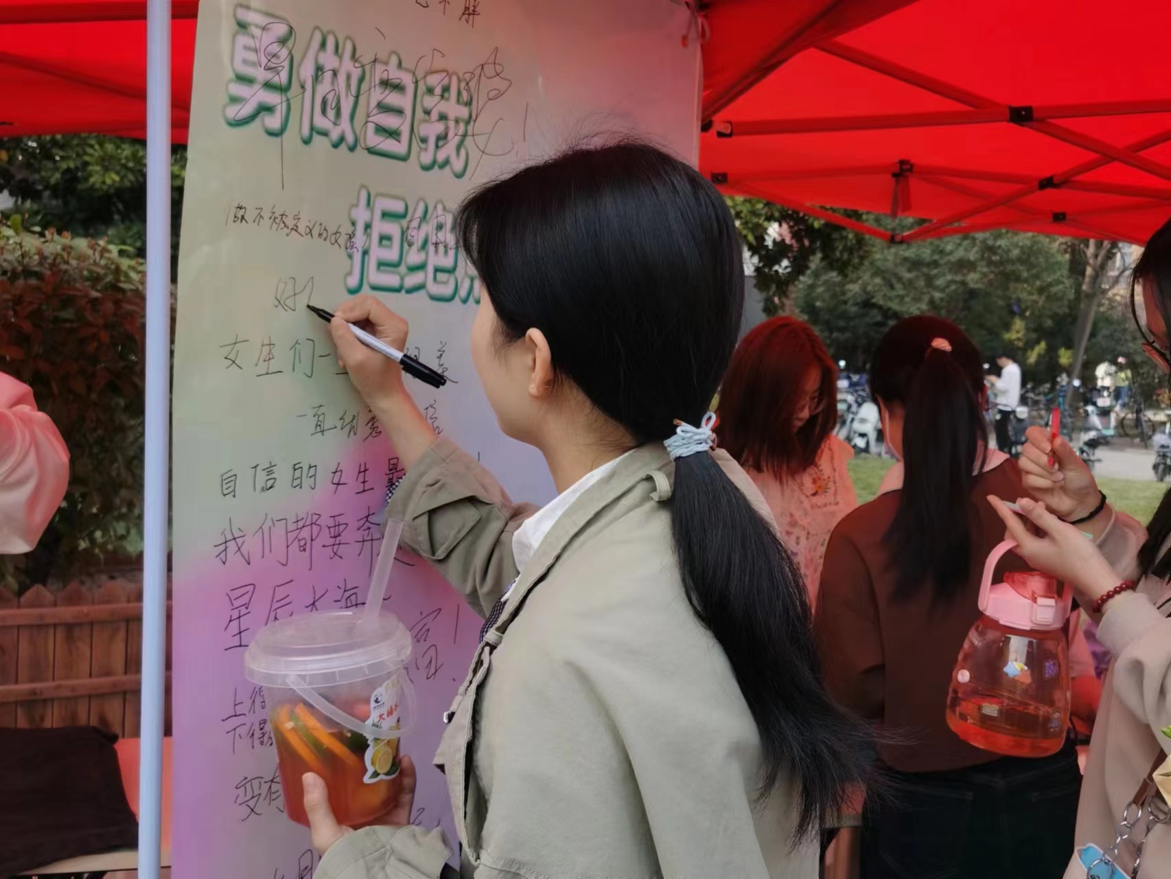 本次活动内容分为“撕掉标签,不被定义”、“拒绝焦虑,畅所欲言”、“桃李寻宝”三个环节。在“撕掉标签,不被定义”环节中,展板海报上会贴有写着对女性刻板印象的“标签”,女生们需要亲手撕掉冠在女性身上的卡片,拒绝被定义,活出精彩自我。伴随着一个个“标签”被撕下,一个个崭新的寄语又重现在板报上,这是参与“拒绝焦虑,畅所欲言”活动的女生们在为自己发声,女生们在便利贴上写下自己想要说的话与祝福亦或是心中的焦虑,写下她们最想打破的对女性的偏见或者有关对女性偏见的故事等,并将其放在指定的箱子中,将语言化作打破偏见的力量。女生们敢为自己发声,不再畏惧偏见和旁人的冷眼,做自己人生的掌舵人,与此同时,完成前两项环节的女生们可以前往“桃李寻宝”的活动现场,她们拿着获得的线索,前往校园的各个角落去寻找事先藏好的鲜花,许多女生在细心查找后得到自己的鲜花,也获得AirAV 对每一位女生在女生节的关爱和祝福。活动期间,也有不少男生来到如火如荼的活动现场,用笔写下了对女生们的欣赏和赞美,为AirAV女生献上了节日祝福。