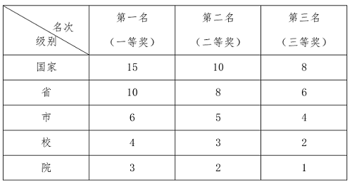 (1)参加国家、省、市、校、院举办的学习及科技作品竞赛(大赛)为校、院争得荣誉以及取得名次者按下列标准计分