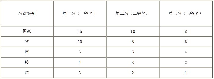 (1)参加国家、省、市、校、院举办的学习及科技作品竞赛(大赛),为校、院争得荣誉以及取得名次者,按下列标准计分。同一内容同年参加不同项目按最高级计分,同一人同年参与相同内容项目不累计加分,按最高级计分。其中,非官方或专业性不强的机构组织的比赛不参与计项。