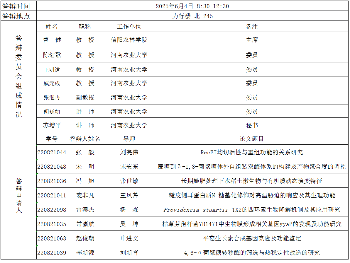 2025年上半年微生物学硕士研究生毕业答辩公告(一)