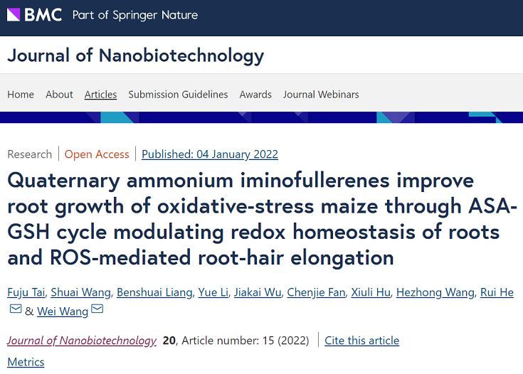 纳米农药团队合作在解析纳米材料促进玉米生长机制研究方面取得重要进展。该研究以“Quaternary ammonium iminofullerenes improve root growth of oxidative-stress maize through ASA-GSH cycle modulating redox homeostasis of roots and ROS-mediated root-hair elongation”为题在线发表于国际知名期刊Journal of Nanobiotechnology。