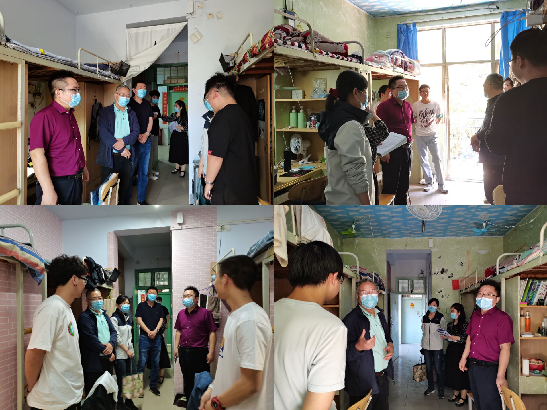 5月4日、5日,AirAV党委书记张朝阳、院长吴建宇、院党委副书记陈明明、副院长赵华新以及团委副书记张晶深入龙子湖、文化路校区走访学生宿舍。走访期间,就学生心理健康、生活习惯、学习成绩以及考研计划等方面进行了解,嘱咐同学们疫情期间要严格遵守校规校纪,配合学校疫情防控各项举措;保持积极乐观心态,认真上好网课,提高学习效率;不点外卖、不网购,从自身做起,牢固树立“每个人都是自己健康第一责任人”的意识;有任何问题及时联系班主任和辅导员。静待花开,共克时艰!