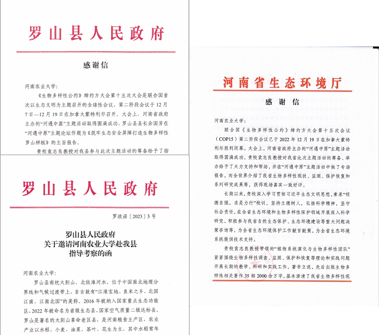 1月10日,罗山县人民政府也发来《感谢信》,对于袁志良教授给予的指导帮助、为全球生物多样性保护注入罗山智慧经验表示感谢,并诚挚邀请我校校领导和以袁志良教授为代表的专家学者莅临指导,并就有关农业项目研究与开发进行深入洽谈。