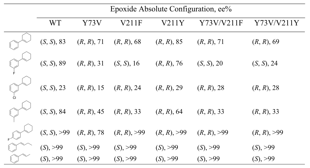 为解析底物性质对SMO催化烯烃环氧化立体选择性的影响机制,作者深入研究了(R)-立体选择性突变体(Y73V, V211F, V211Y, Y73V/V211F, 和Y73V/V211Y)催化不同类型烯烃的立体选择性(表1),发现底物中C=C上脂肪族取代基的大小也影响SMO的立体选择性,显示底物中C=C上脂肪族取代基的大小决定底物与SMO疏水相互作用,从而决定底物在酶底物结合中心的结合方式,进而决定酶催化的立体选择性。