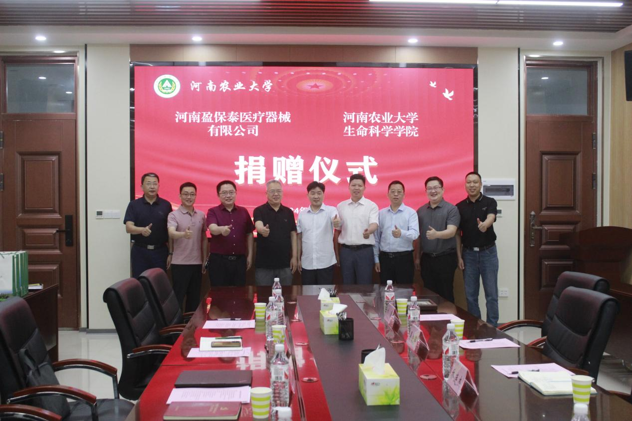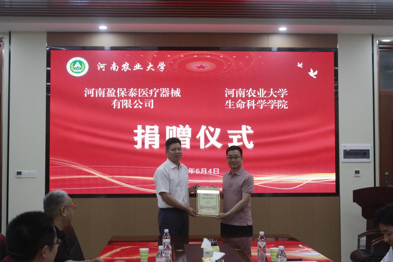 紧接着,张朝阳和河南盈保泰医疗器械有限公司总经理刘涛签订捐赠协议并接受捐赠。河南农业大学校友联络办公室主任胡明忠代表学校向河南盈保泰医疗器械有限公司颁发捐赠证书和纪念品。