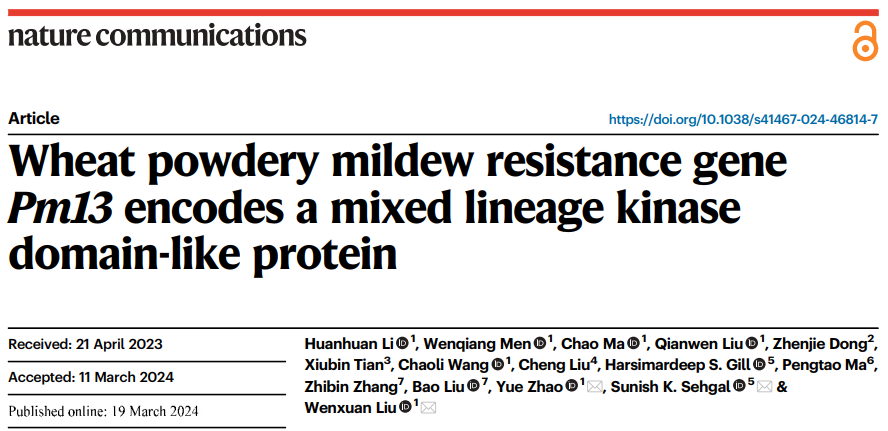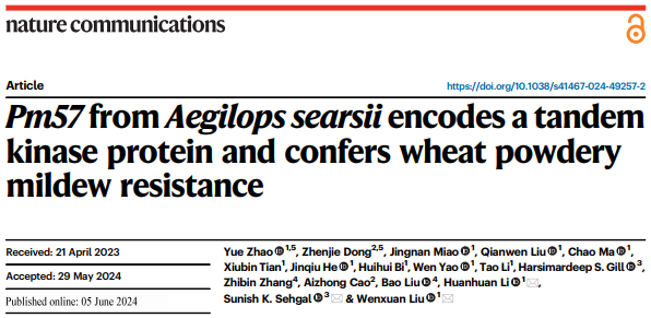 小麦作为世界重要的粮食作物,其产量和质量直接关系到全球粮食安全。白粉病是小麦主要病害之一,严重威胁着小麦的安全生产。鉴定和部署抗性基因被公认是防治该病害最经济有效且环境可持续的途径。至今为止,已有超过100个抗小麦白粉病基因或位点被发现,其中20个基因已被克隆,这些基因大多编码NLR类抗病蛋白。刘文轩课题组将来自小麦野生近缘属山羊草的抗病新基因导入小麦,并连续成功克隆了三个具有创新性的小麦抗白粉病基因——Pm13、Pm57和Pm6Sl。其中Pm13基因编码一种全新的MLKL抗病蛋白,这种蛋白融合了Kinase结构域与MLKL_NTD结构域,这在植物抗病基因中尚属首次报道;Pm57基因则编码一个包含vWA结构域的新型串联激酶抗病蛋白,是目前唯一来源于西尔斯山羊草的抗小麦白粉病基因,也是首个被鉴定编码串联激酶结构域和vWA结构域的抗小麦白粉病基因。