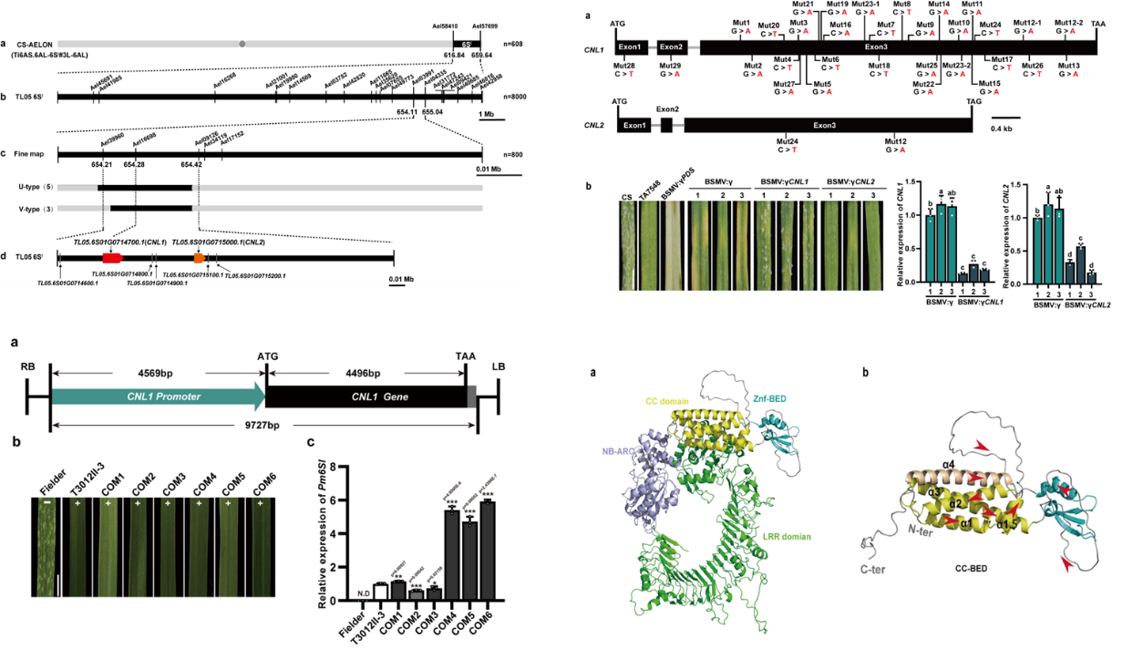 该课题最新克隆的Pm6Sl是来自高大山羊草的抗小麦白粉病基因。该项研究将传统图位克隆技术与现代基因组学手段相结合,综合基因精细定位、Pm6Sl感病突变体转录组测序、基因沉默和转基因功能验证多重结果,成功克隆了Pm6Sl。该基因编码一个整合CC-BED模块的NLR蛋白,是首个被鉴定出编码BED-NLR类蛋白的抗白粉病基因。研究发现Pm6Sl的CC-BED模块具有触发细胞死亡的独特能力,这一特性在其他禾本科BED-NLR抗病蛋白中并不普遍,揭示了BED-NLR类蛋白在抗病机制中可能存在的多样化作用模式。此外,创制了无不良性状连锁的Pm6Sl新种质及其配套的诊断型分子标记pm6sl-1。这三项研究成果不仅极大地丰富了植物抗病基因的类型和抗病机制的理解,更为小麦抗白粉病新品种的培育提供了宝贵的基因资源和理论指导。