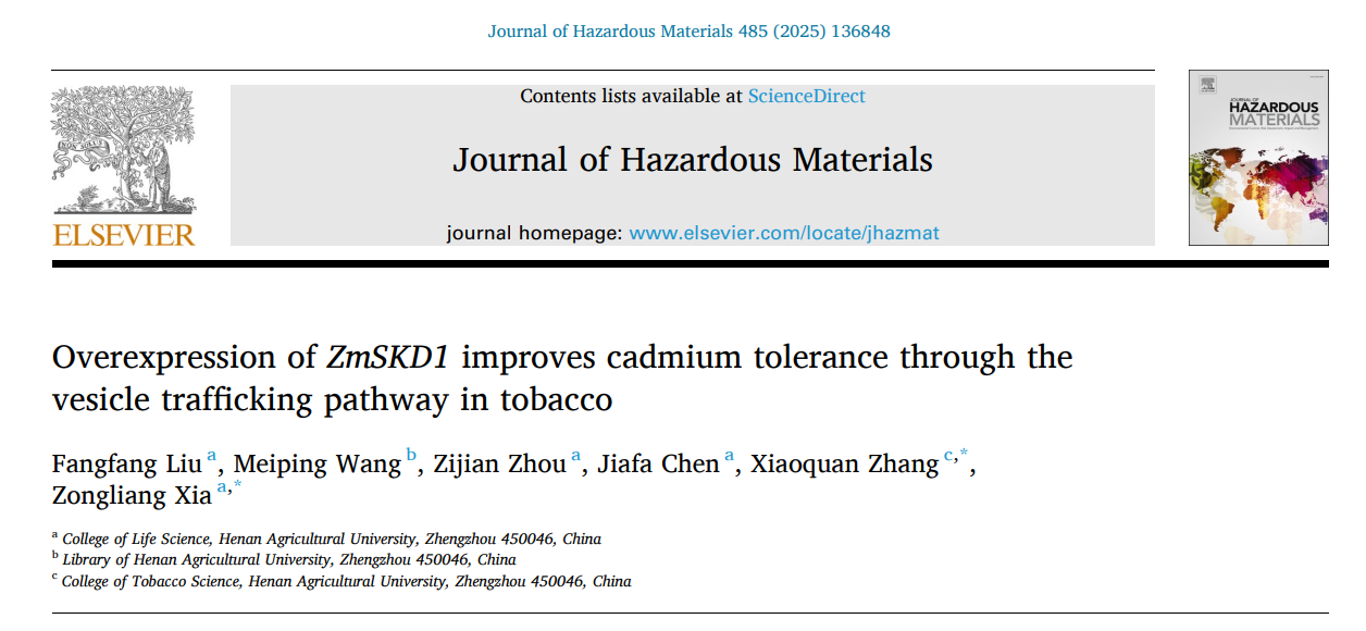 2024年12月12日,AirAV夏宗良教授课题组在读博士生刘芳芳(第一作者)在国际著名学术期刊《Journal of Hazardous Materials》(中科院一区TOP期刊,IF:12.2)在线发表了题为“Overexpression of ZmSKD1 improves cadmium tolerance through the vesicle trafficking pathway in tobacco”的研究论文。这是继今年1月和9月之后,该课题组研究生以第一作者在《Journal of Hazardous Materials》连续发表的第三篇高水平论文。三项创新性成果的发表,集中展示了该课题组在作物抗镉污染关键基因挖掘与调控机理研究领域取得的重要进展,助力作物安全生产和人类生命健康研究。