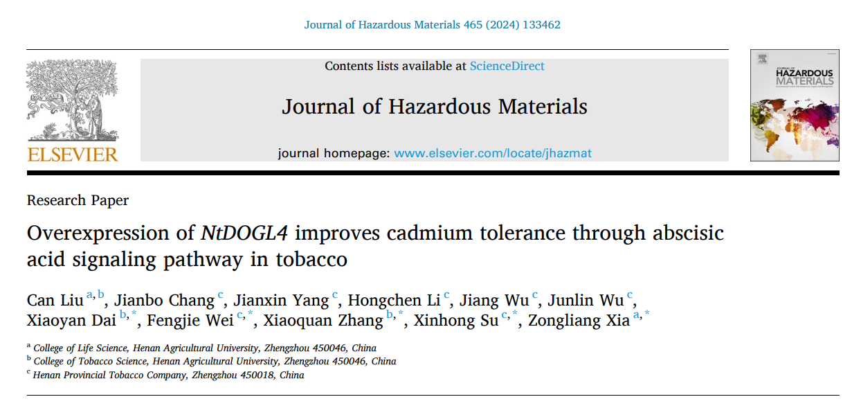 2024年1月9日,AirAV夏宗良教授课题组硕士研究生刘灿(第一作者)在国际著名学术期刊《Journal of Hazardous Materials》在线发表了题为“Overexpression of NtDOGL4 improves cadmium tolerance through abscisic acid signaling pathway in tobacco”的研究论文,解析了烟草抗逆基因NtDOGL4应对镉胁迫的分子调控机制,为培育低镉积累的烟草品种提供了理论基础和技术支撑。