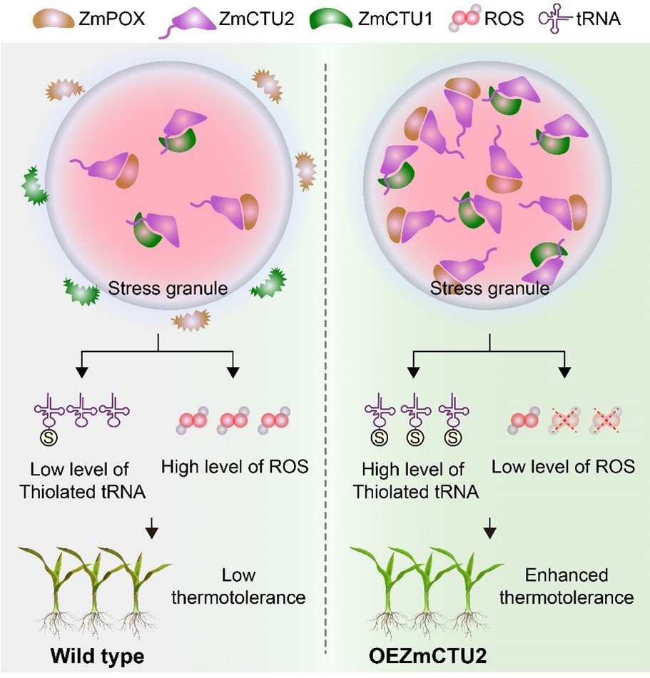 本研究发现,细胞质tRNA 硫醇化蛋白 ZmCTU2 是玉米耐热性调控网络的核心因子,其表达水平与高温环境下玉米籽粒结实率呈显著正相关。过表达 ZmCTU2 能显著提升玉米幼苗期与成株期的耐热能力,有效提高热胁迫下植株存活率及田间产量;而 ZmCTU2 及其互作蛋白 ZmCTU1 的功能缺失突变体,均呈现严重的种子发育缺陷及致死表型。机制解析表明,热胁迫条件下 ZmCTU2 定位于应激颗粒中,通过特异性招募 ZmCTU1 及活性氧清除相关过氧化物酶,避免其受热胁迫降解,形成双重保护机制:一是维持 tRNA 硫醇化修饰效率,保障翻译过程的准确性;二是稳定抗氧化酶系统功能,强化细胞氧化还原稳态。本研究明确 ZmCTU2 作为应激颗粒支架蛋白,可协同调控蛋白质稳态与抗氧化通路,为玉米耐热性遗传改良提供了关键基因资源与理论支撑。