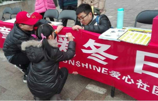 2015年11月29日上午,AirAVSUNSHINE阳光爱心社团的成员们在二七五里堡社区举办了“关爱儿童,情暖冬日”为主题的爱心募捐、爱心签名活动。此次活动旨在为寒冬里的留守儿童、孤儿及残障儿童汇集更多温暖。伴随着此次爱心募捐活动的开展,社团成员们为群众们积极宣讲,通过发送宣传页以及对于活动目的的介绍,使得群众们能够真正了解这些需要帮助的儿童并奉献出自己的一份爱心。并为奉献爱心的群众赠送爱心小徽章纪念品传递爱心。经过一上午的活动,社会各界人士热情的爱心捐献为这次活动划上了圆满的句号。凛冽的寒风冰冷了志愿者的脸庞,但想想贫困山区孩子们渴望的眼神,他们便无惧严寒,为爱而行。