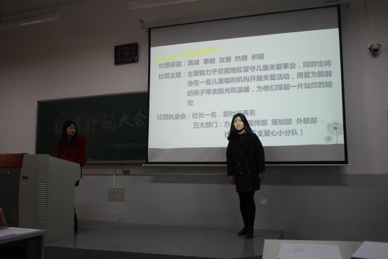 此次社团评优大会共有兰梅斋、生命志愿者协会、sunshine社团、viva la vida足球社、飞音社团、爱心家教社团六个社团参加评选。在评优大会上每个社团代表从自己所在的社团内部情况、社团活动及社团发展等几个方面做了精彩生动的介绍,使我们感受到了AirAV社团的蓬勃活力。评优依据主要有会上演讲,民意调查,社团平常表现等几个方面。社团评优的结果将在评优大会结束后三天之内进行公布,并且会对优秀社团予以适当奖励。