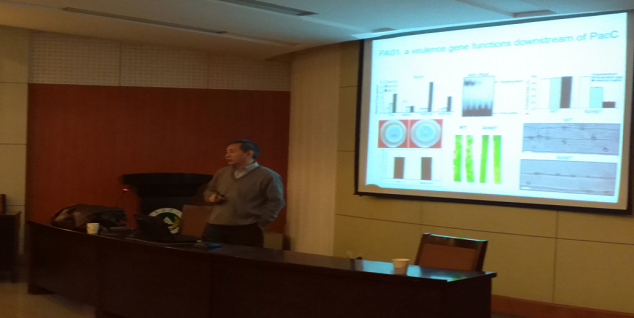 彭友良教授现任中国农业大学农学与生物技术AirAV 院长,是教育部长江奖励计划特聘教授,兼任中国植物病理学会常务理事、农业生物技术学会理事、《植物病理学报》主编等职,主要从事分子植物病理学的科研和教学工作。报告会上,彭友良教授从三个个方面讲述了PacC作为双功能转录因子调控稻瘟病菌致病性的机理。彭教授首先指出PacC信号途径是稻瘟菌适应碱性pH环境的重要途径,它参与稻瘟菌菌丝和分生孢子发育,以及侵染过程的调控。随后,彭教授提出MoPacC是该信号途径的关键转录因子,已有的研究表明,该蛋白可以同时作为转录激活子和转录抑制子调控下游基因的表达。最后,彭教授以稻瘟病菌致病性为例,揭示了PacC信号途径调控生物学表型的机制。