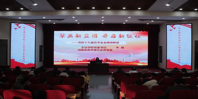牛娟老师以“擘画新蓝图,开启新征程”为主题,首先以“两个百年奋斗目标”为切入点,结合实例,对党的十九届五中全会召开的背景和目的进行了全面解说,对开展全会的目的深入解说;牛娟老师从我校于河南省的作用所在,引出在十九届五中全会后的关于国家发展的五个新表述,阐释了“国家四个全面战略布局”、“科技自立自强”、“全面推进乡村振兴”、“我国发展仍然处于重要战略机遇期”“在危机中育先机、于变局中开新局”的详细目标;最后以学生自身为例,号召在座学生牢记农大人的使命和情怀,深刻领会全会精神的科学内涵和精神实质,争做学习全会精神、宣传全会精神的示范者,谱写中国时代新篇章。