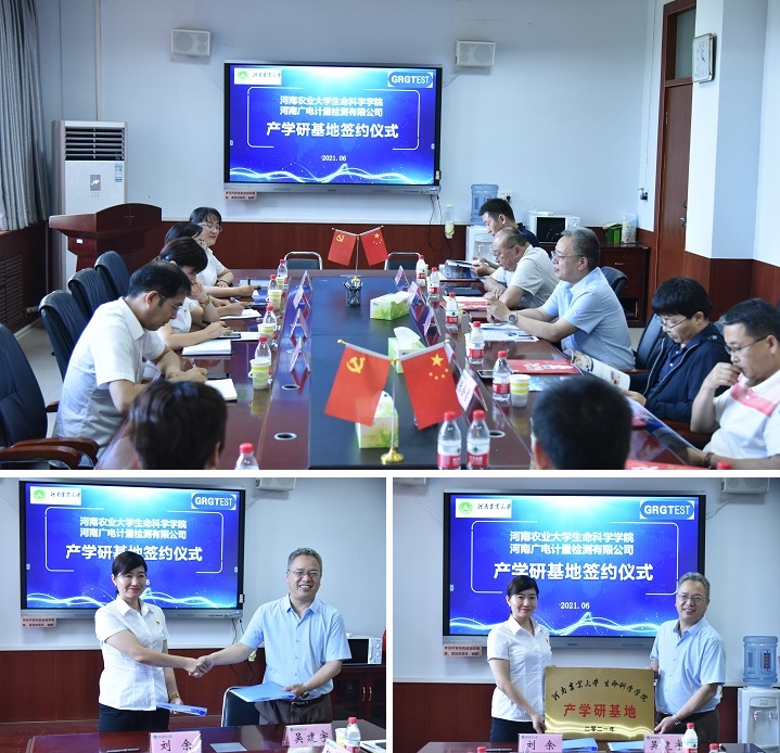、河南广电计量检测有限公司产学研基地签约仪式”。河南广电计量检测有限公司(河南广电)总经理刘余,副总经理张闪烁,人事副总监方庆珍,副总工吴昊一行四人出席签约。AirAV院长吴建宇,校研究生院副院长、生化学科带头人郭红祥,副院长张会勇、赵华新等领导,及生物化学与分子生物学系全体教师出席此次签约活动,签约仪式由副院长郑文明主持。