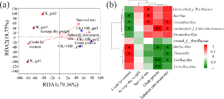 该研究进一步通过高通量测序揭示了贝莱斯芽孢杆菌10B对黑水虻幼虫肠道微生物菌群的互作影响及其在餐厨垃圾生物转化中的作用机制。证实贝莱斯芽孢杆菌10B菌株能在黑水虻幼虫肠道中定殖,并改变幼虫肠道中微生物群落结构。通过冗余分析(RDA)分析,发现存活率、物料转化率、幼虫干重和粗蛋白含量与贝莱斯芽孢杆菌10B菌株添加呈显著正相关,粗脂肪含量与贝莱斯芽孢杆菌10B菌株添加呈显著负相关。Pearson 相关性分析发现芽胞杆菌属(Bacillus)、喜热菌属(Caloramator)和薄壁芽胞杆菌属(Gracilibacillus )与蛋白含量呈正相关。因此认为添加贝莱斯芽孢杆菌10B后,是通过影响这三类芽孢杆菌属的相对丰度来提高黑水虻幼虫的蛋白含量(图1)。
