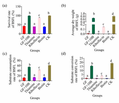 为了进一步验证10B在黑水虻幼虫底物转化过程中的作用,团队将10B、硫胺素、核黄素、生物素分别添加进餐厨底物中饲喂黑水虻幼虫,发现只有单独添加10B或核黄素后,黑水虻幼虫的存活率可达98%以上,与自然饲喂的黑水虻幼虫存活率相当。这一结果证实,贝莱斯芽孢杆菌10B 通过向宿主提供核黄素提高了黑水虻幼虫的存活率。核黄素添加组幼虫的物料转化率及幼虫干重低于添加10B和自然培养组,也表明10B在将底物转化为营养物质方面也起着关键作用(图3)。本研究解析了益生菌、肠道微生物和黑水虻幼虫之间的关系,揭示了贝莱斯芽孢杆菌 10B增加黑水虻幼虫蛋白含量的作用机,为更好地利用黑水虻幼虫处理――提供了新方案
