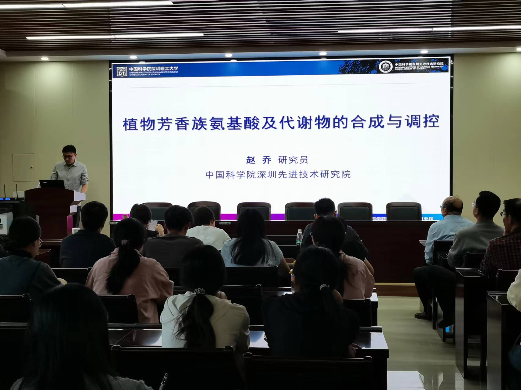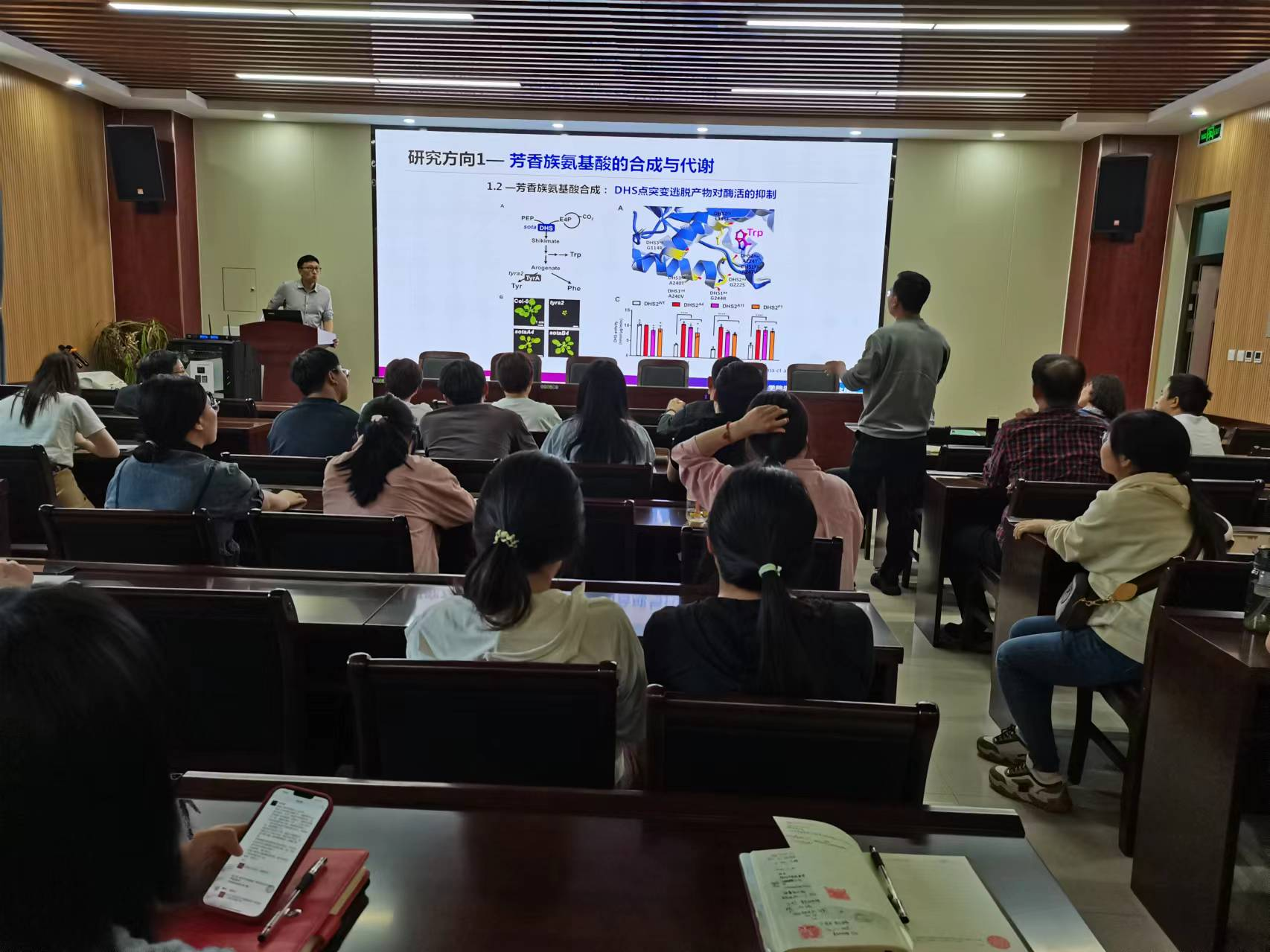 赵乔长期从事植物芳香族代谢物的合成与调控的研究,先后在Science Advances, Molecular Plant, Nature Communications等国际专业期刊上共发表SCI论文11篇。2021,2023年入选全球前2%顶尖科学家榜单(美国斯坦福大学与爱思唯尔数据库(Elsevier)联合发布)。本次报告围绕植物芳香族化合物的合成、次生代谢物(木质素和类黄酮)的合成与调控以及糖基化修饰展开,介绍了他课题组以拟南芥为研究对象,通过正向遗传学筛选到几个芳香族化合物合成相关的突变体,详细解析了调控芳香族化合物及次生代谢物合成的作用机制。另外,也介绍了糖基化修饰在植物耐受低铁胁迫中的作用。本次报告让师生们对芳香族化合物有了新的认识,也对它们的合成研究产生了浓厚的兴趣。