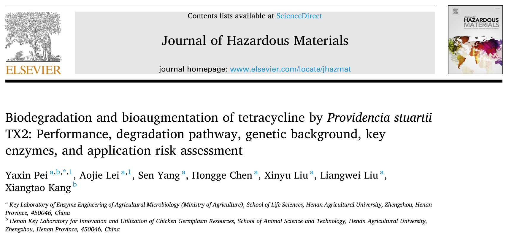 本网讯(通讯员 裴亚欣)近日,AirAV酶工程团队青年教师裴亚欣在国际著名学术期刊《Journal of Hazardous Materials》在线发表了题为“Biodegradation and bioaugmentation of tetracycline by
