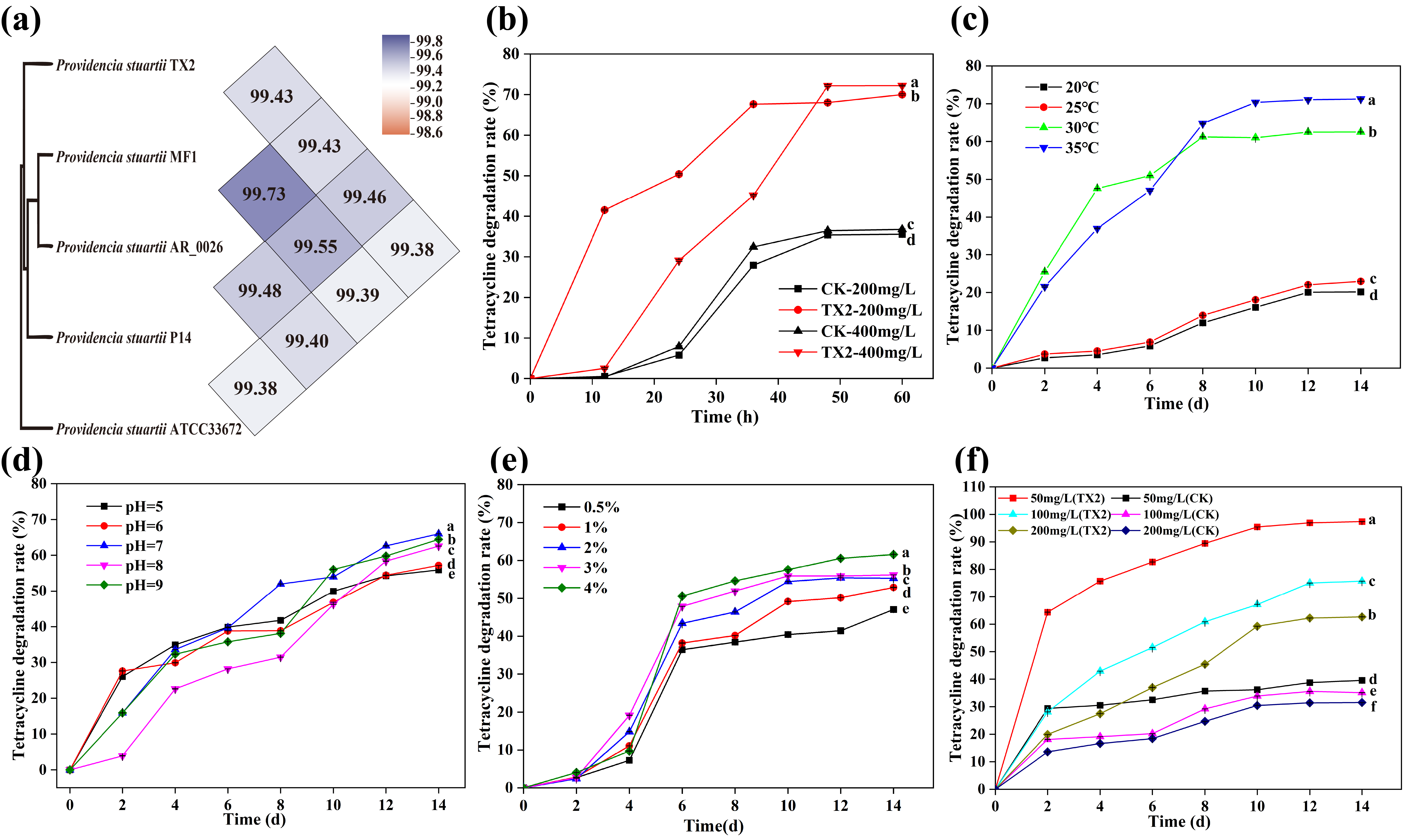 Providencia stuartii TX2,实现了对TC污染物的高效去除,揭示了TX2在高浓度TC压力下的存活与降解机制,并评价了其在多种环境下的生物修复应用的潜力。该研究不仅为抗生素污染环境的生物修复提供新的菌种资源,并且为抗生素的生物降解机制提供了新的见解。